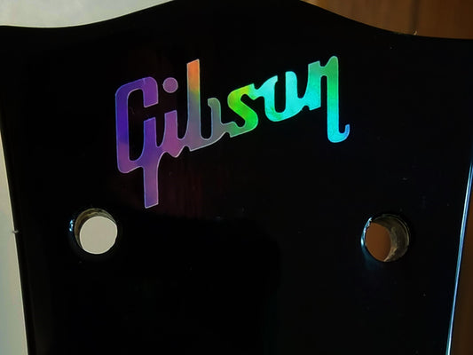 Gibson Guitar Headstock Logo Die-Cut Metalized Decal, Oil Slick Aluminum OEM Sze LOT x2